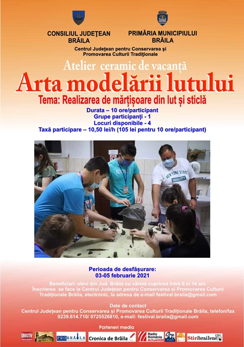 Consiliul Județean Brăila, cu sprijinul Primăriei Municipiului Brăila şi Centrul Județean pentru Conservarea și Promovarea Culturii Tradiționale Brăila organizează în intervalul 03-05 februarie 2021 „Atelierul ceramic de vacanță – Arta modelării lutului”, având ca temă realizarea de mărțișoare din lut și sticlă, sub îndrumarea unui specialist.