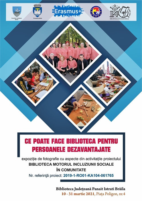 Proiectul european ”Biblioteca, motorul incluziunii sociale”, finanțat prin Programul Erasmus+ al Uniunii Europene, este pus în valoare prin intermediul unei expoziții de fotografie sub titlul “Ce poate face biblioteca pentru persoanele dezavantajate?”. Coordonatorul proiectului, desfășurat de Biblioteca Județeana ”Panait Istrati” din Braila, este dr. Eduard Claudiu Brăileanu, șef serviciu Relații cu Publicul în cadrul bibliotecii brăilene.