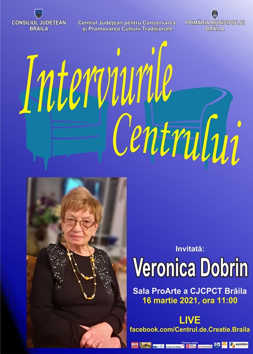 Consiliul Județean Brăila, cu sprijinul Primăriei Municipiului Brăila şi Centrul Județean pentru Conservarea și Promovarea Culturii Tradiționale Brăila vă invită să participați în data de 16 martie 2021, la evenimentul cultural Interviurile Centrului, începând cu ora 11:00, cu invitatul special Veronica Dobrin, Doamna de Aur a culturii brăilene, ce a scris istorie, prin ani mulți de muncă şi dăruire.