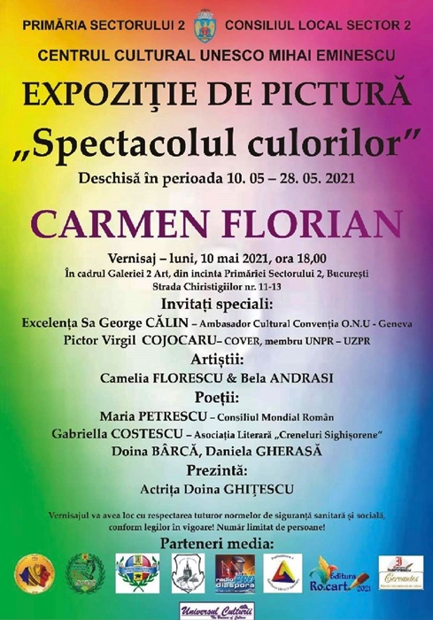 Luni, 10 mai 2021, pictorița Carmen Florian, diafană și delicată cum o cunoștem, are deja invitațiile confirmate pentru întreaga capacitate a incintei Primăriei Sectorului 2 București, unde va avea loc vernisajul expoziției sale de lucrări ce poartă sugestiv titlul „Spectacolul Culorilor”. Organizatorii, Primăria Sectorului 2, Consiliul Local sector 2 și Centrul Cultural Mihai Eminescu ne promit un eveniment de neuitat.