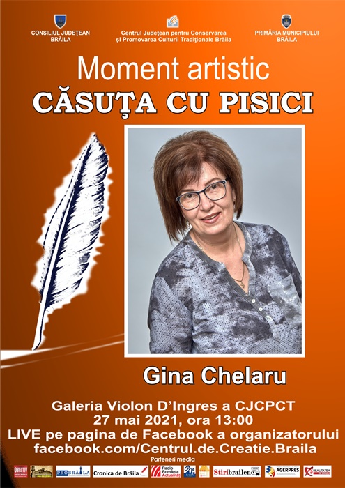 Consiliul Județean Brăila, Primăria Municipiului Brăila şi Centrul Județean pentru Conservarea și Promovarea Culturii Tradiționale Brăila, vă invită să participați în data de 27 mai 2021, ora 13:00 la evenimentul cultural „Moment artistic cu Gina Chelaru”, creator handmade, fondatoarea brandului „Căsuța cu pisici”, ce ne va introduce în lumea unicității, a unei lumi cu produse altfel, separate de comercial.