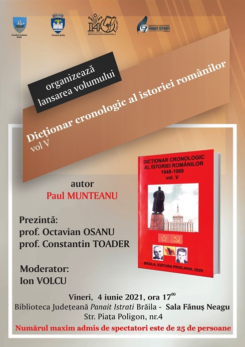 Biblioteca Județeană “Panait Istrati” Brăila invită iubitorii de carte, vineri, 4 iunie 2021, începând cu ora 17:00, la lansarea cărții “Dicționar cronologic al istoriei românilor 1948-1989”, volumul 5, semnat de prof. Paul Munteanu.