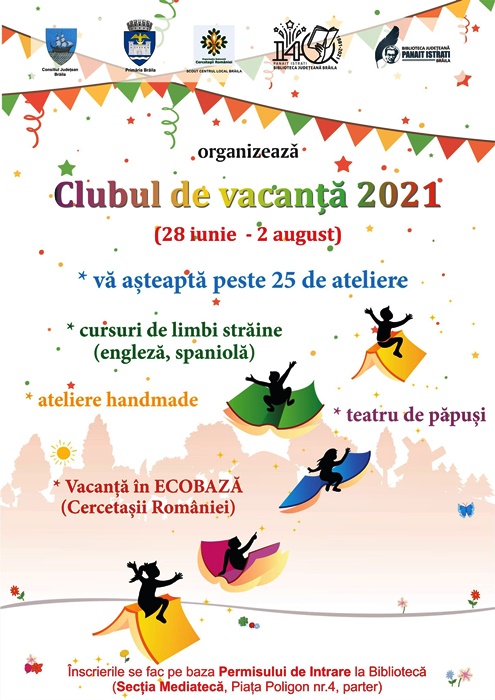 Biblioteca Județeană „Panait Istrati” Brăila organizează în perioada 28 iunie – 6 august 2021, mult-așteptatul „Club de Vacanță”, după un an de pauză, impusă de pandemia de coronavirus. Pregătim peste 25 de ateliere, pentru toate gusturile, începând cu cele de informatică, radiocomunicații, incubatorul de afaceri, până la cele de limbi străine, îndemânare, handmade și artistice.