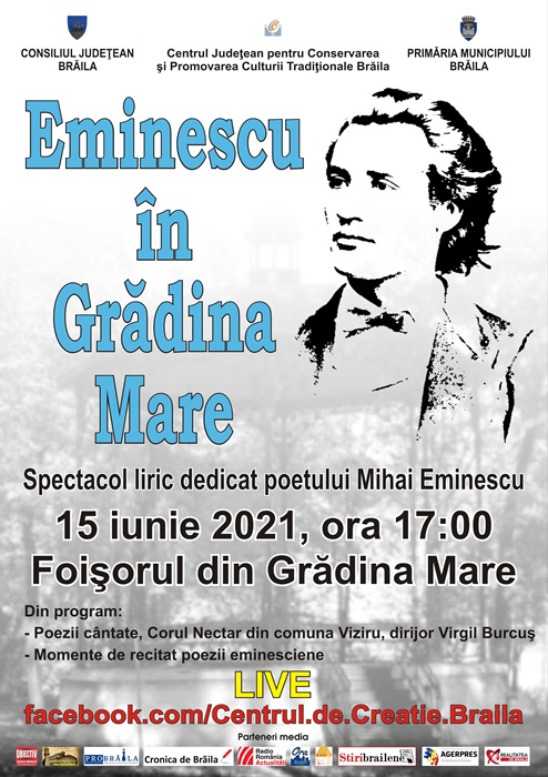 Consiliul Județean Brăila, Primăria Municipiului Brăila şi Centrul Județean pentru Conservarea și Promovarea Culturii Tradiționale Brăila organizează în data de 15 iunie 2021, ora 17:00, evenimentul cultural „Eminescu în Grădina Mare” – Spectacol literar-artistic dedicat omagierii poetului Mihai Eminescu.