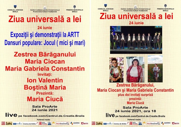 Consiliul Județean Brăila, Primăria Municipiului Brăila și Centrul Județean pentru Conservarea și Promovarea Culturii Tradiționale Brăila au bucuria de a vă invita să participați la celebrarea „Zilei Universale a Iei”, odată cu sărbătoarea creștină a Nașterii Sfântului Ioan Botezătorul și cea străveche a Sânzienelor și Drăgaicei, din apropierea Solstițiului de vară (21 iunie).
