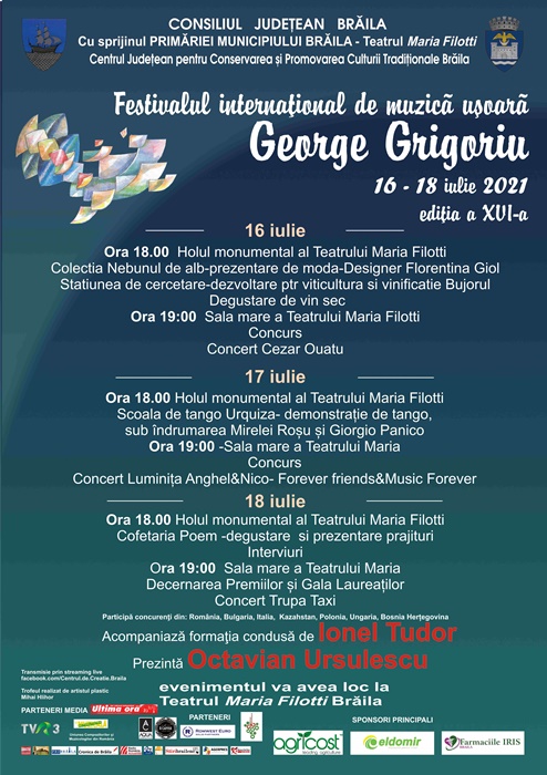 Consiliul Județean Brăila, Primăria Municipiului Brăila – Teatrul „Maria Filotti” și Centrul Județean pentru Conservarea și Promovarea Culturii Tradiționale Brăila organizează în perioada 16-18 iulie 2021, cea de-a XVI-a ediție a Festivalului Internațional de Muzică Ușoară „George Grigoriu”.