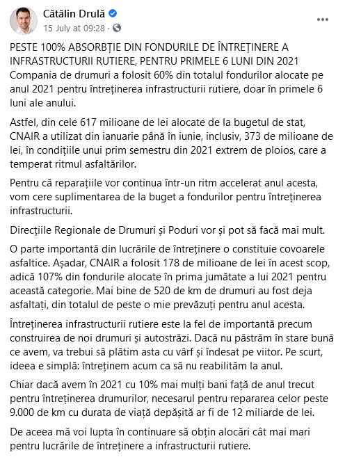 „Peste 100% absorbție din fondurile de întreținere a infrastructurii rutiere, pentru primele 6 luni din 2021.”, a declarat joi, 15 iulie 2021, ministrul Cătălin Drulă într-o postare publică pe Facebook.