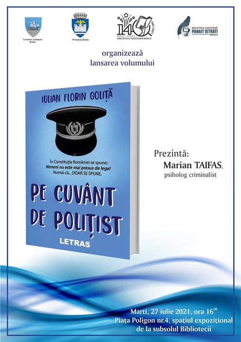 Evenimentul de lansare a cărții “Pe cuvânt de polițist” va avea loc marți, 27 iulie 2021, ora 16:30, în spațiul expozițional de la subsolul Bibliotecii Județene „Panait Istrati” Brăila. Prezintă Marian Taifas, psiholog criminalist.