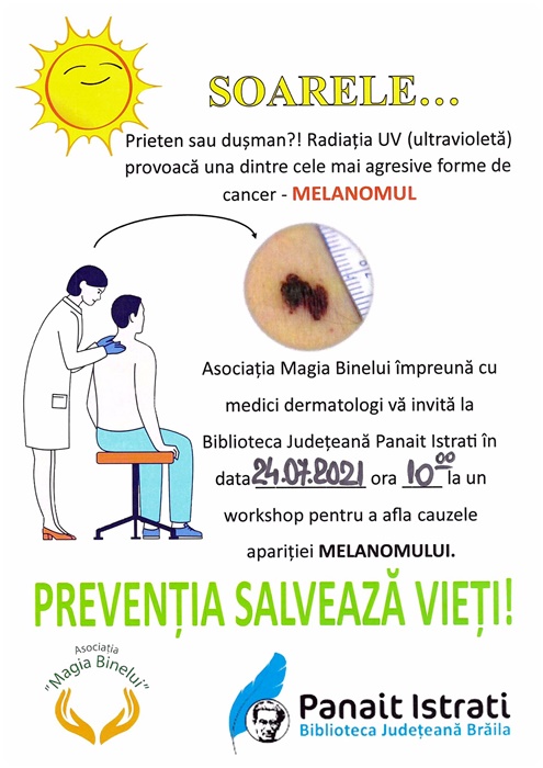 Biblioteca Județeană “Panait Istrati” Brăila găzduiește sâmbătă, 24 iulie 2021, ora 10:00, întâlnirea organizată de Asociația “Magia Binelui” care are ca temă Prevenția melanomului și riscurile pe care le presupune expunerea neprotejată la radiația UV.