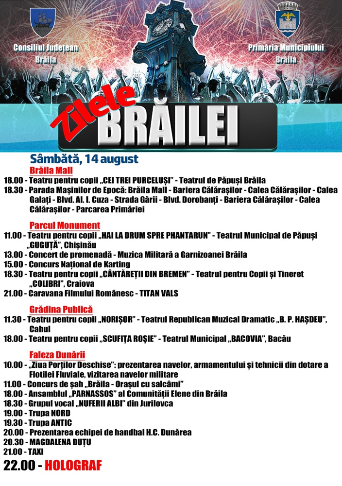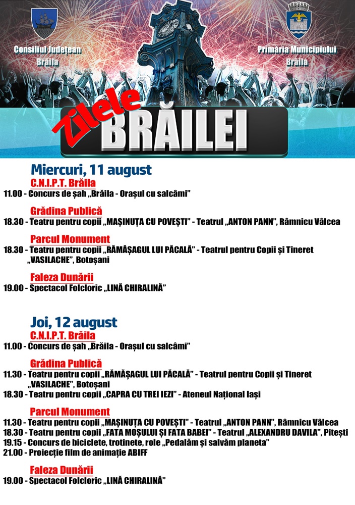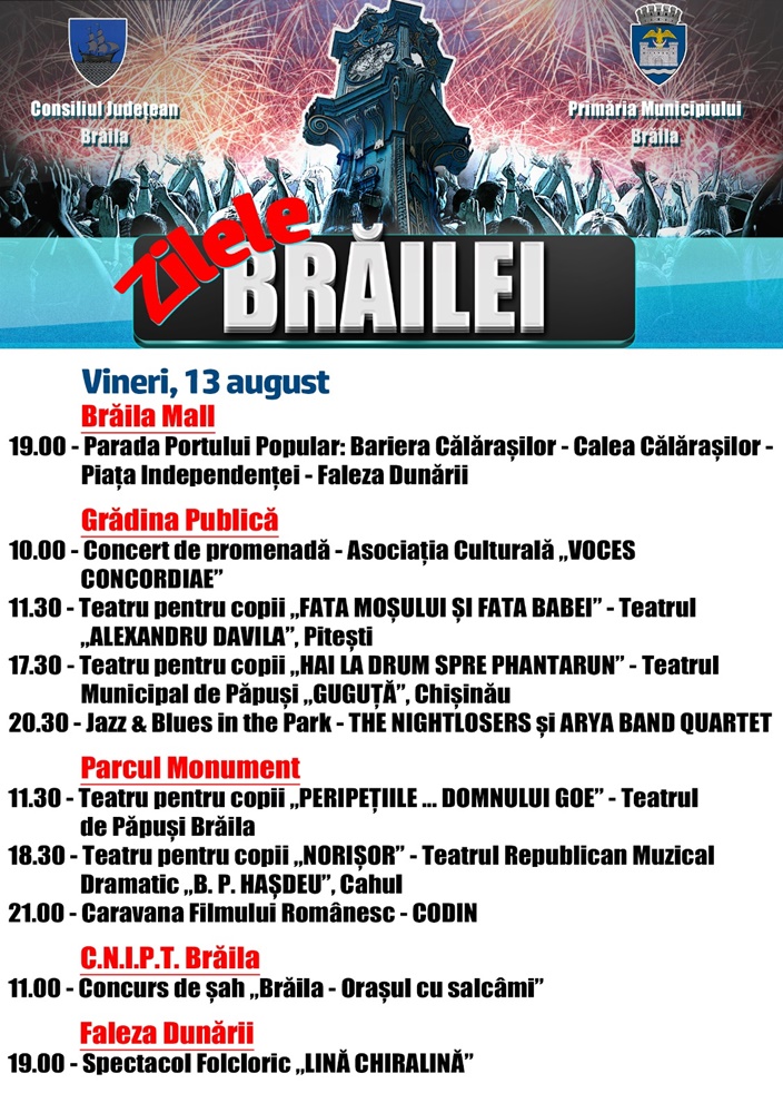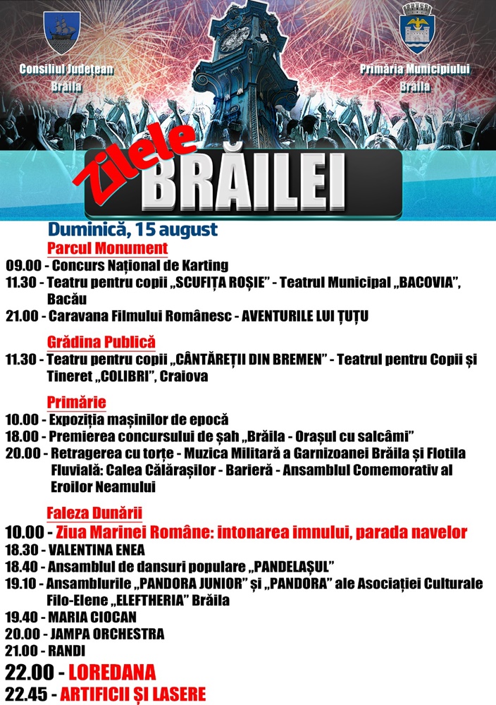 Loredana, Taxi, Holograf, Jazz&Blues in the Park – The Nightlosers și ARYA Band Quartet, Jampa Orchestra, Randi, Spectacolul Folcloric „Lină Chiralină” sunt doar câteva dintre atracțiile Zilelor Municipiului Brăila, sărbătorite și în acest an, în perioada 9–15 august. Muzică, dans, teatru, film, expoziții, târguri, paradă militară și multe altele vor constitui punctele de atracție ale brăilenilor în aceste zile, toate aceste evenimente fiind organizate de Primăria Municipiului Brăila și Consiliul Județean Brăila în colaborare cu diferite instituții.