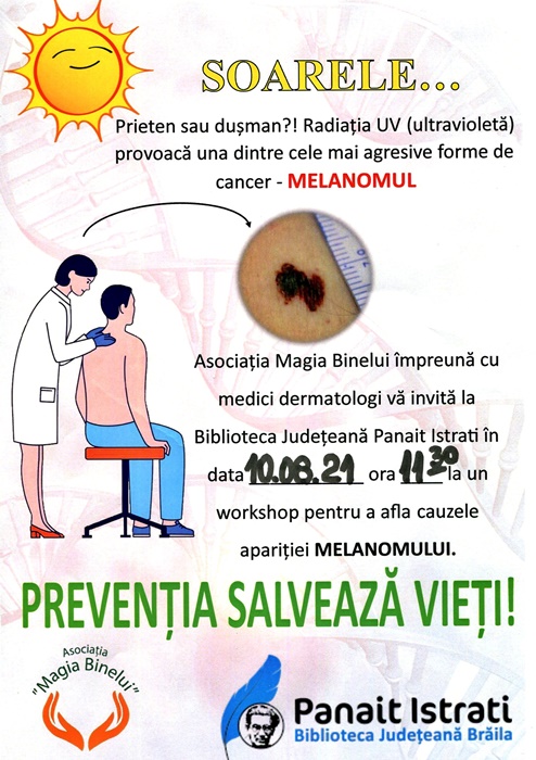 Biblioteca Județeană “Panait Istrati”, din Municipiul Brăila, găzduiește marți, 10 august 2021, începând cu ora 11:30, al doilea workshop organizat de Asociația „Magia Binelui”. De această dată, tema propusă este „Prevenția melanomului și riscurile pe care le presupune expunerea neprotejată la radiația UV”.