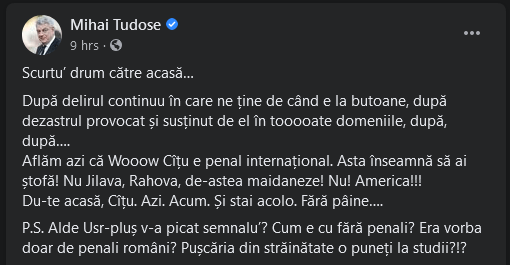 „După delirul continuu în care ne ține de când e la butoane, după dezastrul provocat și susținut de el în tooooate domeniile, după, după… Aflăm azi că Wooow Cîțu e penal internațional. Asta înseamnă să ai ștofă! Nu Jilava, Rahova, de-astea maidaneze! Nu! America!!!”