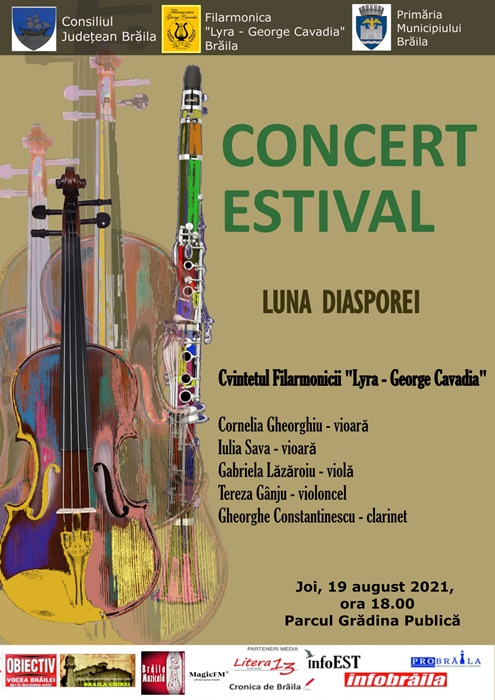 Un nou concert estival, marca Filarmonica “Lyra – George Cavadia” Brăila, va avea loc joi, 19 august 2021, începând ora 18:00, în Parcul Grădina Publică, în formula deja binecunoscută: Cornelia Gheorghiu – vioara I, Iulia Sava – vioara II, Gabriela Lăzăroiu – violă, Tereza Gânju – violoncel și Gheorghe Constantinescu – clarinet, instrumentiști ce formează Cvintetul Filarmonicii “Lyra – George Cavadia”.