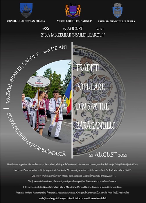 Muzeul Brăilei „Carol I” organizează în data de 21 august 2021, manifestarea sub titlul „Tradiții populare din spațiul Bărăganului”, cu prilejul aniversării împlinirii a 140 de ani de la înființarea acestei instituții brăilene.
