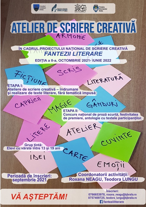 Atelierul se va desfășura în perioada octombrie 2021 – februarie 2022 și este destinat elevilor cu vârste cuprinse între 13 și 19 ani. Pe parcursul întâlnirilor, participanții vor deprinde tehnici de redactare, scopul fiind finalizarea unui text literar, care va avea șansa să participe la cea de-a doua etapă a proiectului – Concursul național de proză scurtă “Fantezii literare”.