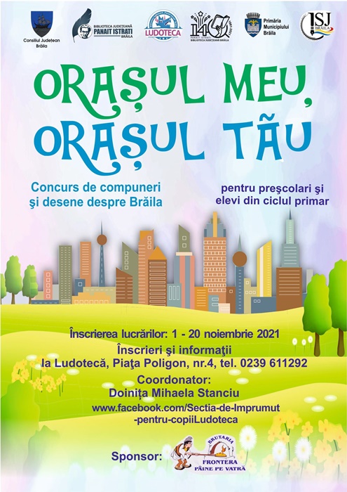 Știm că Brăila este un oraş cu mulţi copii talentaţi, tocmai de aceea Biblioteca Judeţeană „Panait Istrati” – Secția de Împrumut pentru Copii. Ludoteca în parteneriat cu Inspectoratul Școlar Județean Brăila lansează concursul de desene şi eseuri cu tema “Oraşul meu, oraşul tău”, ediția a VIII-a.