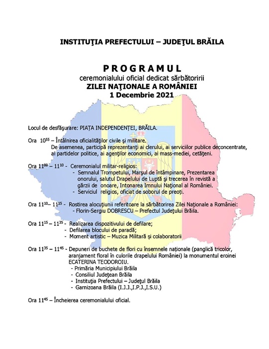 Potrivit informațiilor oferite de reprezentanții Instituției Prefectului – Județul Brăila, Programul ceremonialului official, dedicat sărbătoririi Zilei Naționale a României, 1 Decembrie 2021 este următorul: