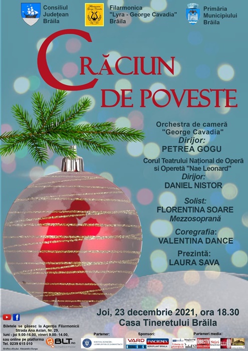 „Crăciun de poveste” este titlul concertului vocal-instrumental extraordinar unde Filarmonica “Lyra-George Cavadia”, alături de Consiliul Județean Brăila și Primăria Municipiului Brăila invită brailenii să ia parte în ziua de joi, 23 decembrie 2021, ora 18:30, la Casa Tineretului Brăila.