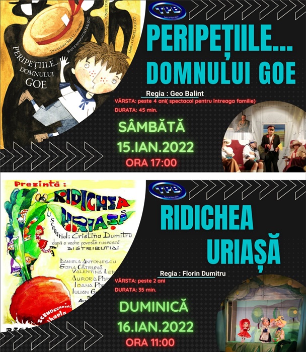 De asemenea, duminică,16.01.2022, începând cu ora 11:00 – va fi jucat spectacolul „Ridichea uriașă”, un spectacol cu păpuși ce se adresează copiilor cu vârste cuprinse între 2-12 ani.