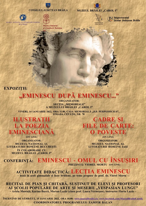 Sâmbătă, 15 ianuarie 2022, începând cu ora 10:00, pe site-ul www.muzeulbrailei.ro şi pe www.facebook.com/MuzeulBraileiCarolI evenimentul „Eminescu după Eminescu…”, organizat de Muzeul Brăilei „Carol I”, în parteneriat cu Muzeul Național al Literaturii Române București, Muzeul Național al Literaturii Române Iași, Inspectoratul Școlar Județean Brăila și Școala Populară de Arte și Meserii „Vespasian Lungu” Brăila, va continua să se desfășoare în mediul virtual.