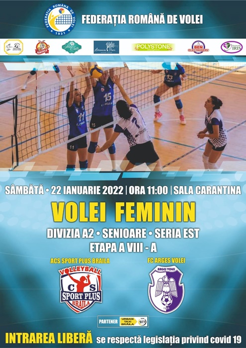 Sâmbătă, 22 ianuarie 2022, începând cu ora 11:00, la Sala Carantina din Municipiul Brăila, se va juca partida de volei feminin dintre ACS Sport Plus Brăila și FC Argeș Volei.