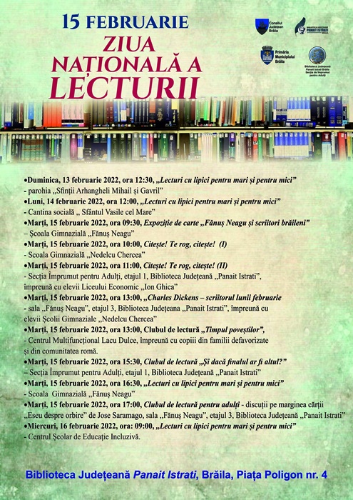 România celebrează pentru prima dată „Ziua națională a lecturii” pe 15 februarie. Cu acest prilej, Biblioteca Județeană „Panait Istrati” Brăila organizează o serie de sesiuni de lectură și expoziții de carte în perioada 13 – 16 februarie 2022. Programul evenimentelor cuprinde: