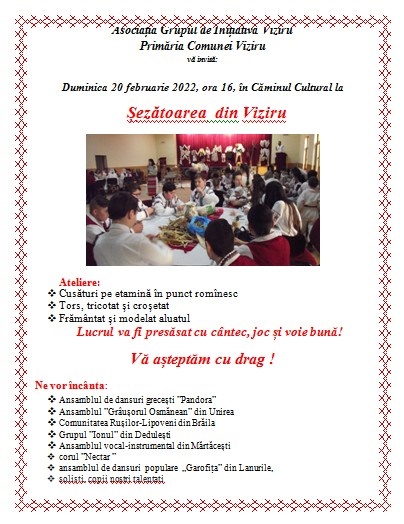 Duminică, 20 februarie 2022, Primăria Comunei Viziru împreună cu Asociația Grupul de Inițiativă Viziru vor organiza cea de-a 4 a ediție a Șezătorii din Viziru.