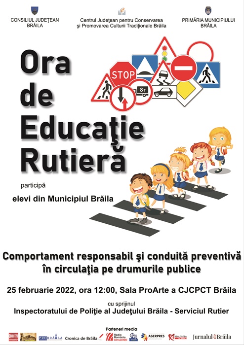 Consiliul Județean Brăila, Primăria Municipiului Brăila, Centrul Județean pentru Conservarea și Promovarea Culturii Tradiționale Brăila, cu sprijinul Inspectoratului de Poliție Județean Brăila – Serviciul Rutier organizează în data de 25 februarie 2022, începând cu ora 12:00, în Sala ProArte a Centrului Județean pentru Conservarea și Promovarea Culturii Tradiționale Brăila, acțiunea intitulată „Ora de educație rutieră”, ce își propune să conștientizeze elevii și nu numai, cu privire la problemele care pot apărea pe timpul deplasărilor în spații rutiere și să le îmbunătățească acestora cunoștințelor privind regulile de circulație în calitate de pieton în mediul urban.