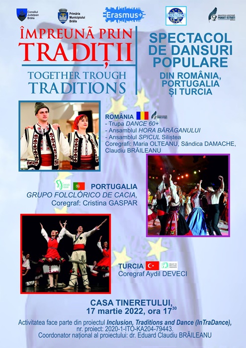 Joi, 17 martie 2022, ora 17:30, la Casa Tineretului din Brăila va avea loc spectacolul gratuit de dansuri populare tradiționale din România, Portugalia și Turcia intitulat: “Împreună prin tradiții” (Together through traditions).