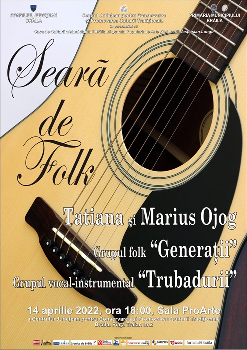 Consiliul Județean Brăila, Primăria Municipiului Brăila şi Centrul Județean pentru Conservarea și Promovarea Culturii Tradiționale Brăila în parteneriat cu Casa de Cultură a Municipiului Brăila și Școala Populară de Arte și Meserii Vespasian Lungu invită brăilenii la o „Seară de folk”.
