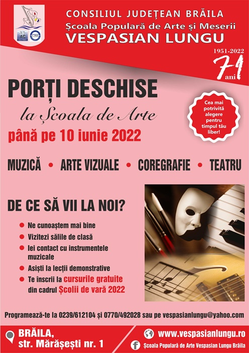 Şcoala Populară de Arte şi Meserii „Vespasian Lungu” Brăila invită doritorii din instituţiile de învăţământ preuniversitar din Municipiul şi Judeţul Brăila să-i păşească pragul sediului din Municipiul Brăila, strada Mărăşeşti, nr. 1, până pe 10 iunie 2022, de luni până vineri, între orele 10:00 – 14:00, în cadrul Programului „Porți deschise la școala de arte – 2022”.