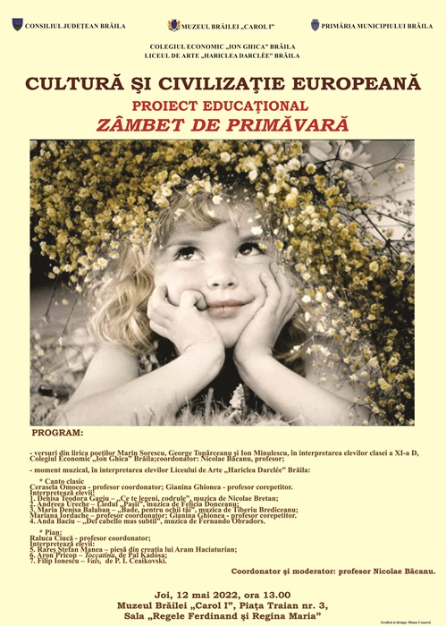 Muzeul Brăilei „Carol I” găzduiește joi, 12 mai 2022, ora 13:00, în sala „Regele Ferdinand și Regina Maria” (Piaţa Traian nr. 3), o nouă etapă a proiectului educaţional „Cultură și civilizație europeană”, organizat de Colegiul Economic „Ion Ghica” Brăila, în colaborare cu Liceul de Arte „Hariclea Darclée” Brăila și Muzeul Brăilei „Carol I”.