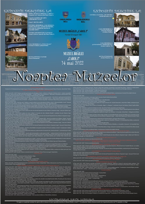 Muzeul Brăilei „Carol I” organizează sâmbătă, 14 mai 2022, Noaptea Muzeelor, un eveniment aflat la cea de-a XVIII-a ediție, ce se va desfășura în intervalul orar 16:00 – 24:00.