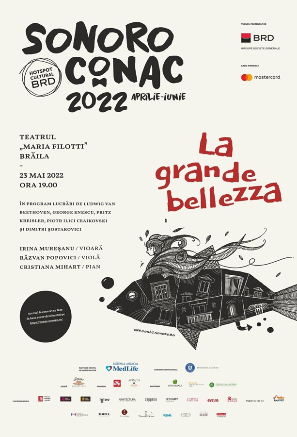 Turneul SoNoRo Conac, după ce a debutat în luna aprilie, sărbătorește frumusețea arhitecturală și culturală cu un concert la Teatrul „Maria Filotti” din Brăila, susținut de muzicienii Irina Mureșanu (vioară), Răzvan Popovici (violă) și Cristiana Mihart (pian). Accesul este gratuit, doar în baza rezervării locurilor, iar concertul este urmat de un cocktail oferit de Illy și Avincis.