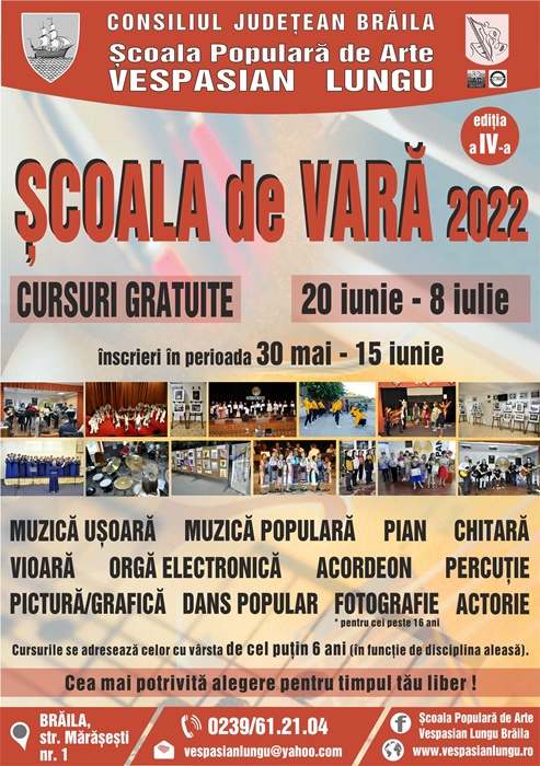 Şcoala Populară de Arte şi Meserii „Vespasian Lungu” Brăila invită doritorii din Municipiul şi Judeţul Brăila să se înscrie la cea de a patra ediţie a Școalii de vară care se va desfăşura, după un program flexibil, în perioada 20 iunie – 8 iulie 2022, de luni până vineri, la sediul din Municipiul Brăila, strada Mărăşeşti, nr. 1.