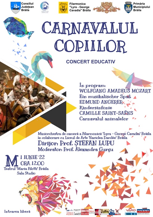 Miercuri, 1 iunie 2022, de la ora 12:00, în Sala Studio a Teatrului “Maria Filotti” din Brăila, cei care iubesc muzica sunt invitați să descopere câteva din tainele sale, îndrumați în acest periplu de prof. Alexandra Gurgu, moderator al concertului “Carnavalul copiilor”. Acesta este un concert oferit de copii și profesorii lor, elevilor din ciclurile primar și gimnazial cât și tuturor celor care vor să redevină copii, preț de câteva minute, și să se bucure de muzică.