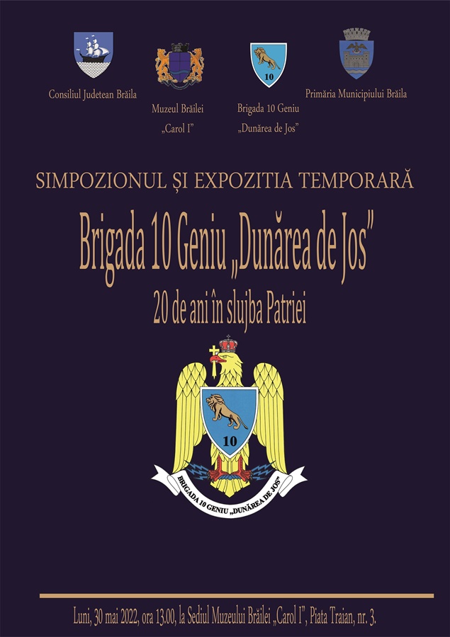 Muzeul Brăilei „Carol l” în colaborare cu Brigada 10 Geniu „Dunărea de Jos” organizează în data de 30 mai 2022, cu începere de la ora 13:00, la sediul din Piața Traian, nr. 3, o serie de evenimente menită a marca cei 20 de ani de existență ai Brigăzii Geniu „Dunărea de Jos”.