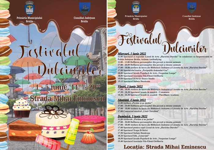 Cu ocazia sărbătoririi zilei de 1 Iunie, Ziua Internațională a Copilului, la Brăila va avea loc Festivalul Dulciurilor, ce se va desfășura în perioada 1 – 5 iunie 2022, pe strada Mihai Eminescu.