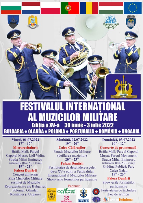 Uniţi de acest nobil ţel, în perioada 01-03 iulie 2022, vor concerta la Brăila: Portuguese Army Fanfare – Portugalia, Muzica Reprezentativă a Forțelor Terestre Bulgare, Regimentul Fanfare of the Garde Grenadiers – Olanda, The Military Band in Cracow –Polonia, Muzica Militară a Brigăzii 5 Infanterie – Ungaria, Muzica Militară a Statului Major al Forțelor Navale, Muzica Militară a Diviziei 2 Infanterie, Muzica Militară a Brigăzii 30 Gardă, Muzica Militară a Brigăzii 81 Mecanizată, Muzica Militară a Diviziei 4 Infanterie, Muzica Militară a Brigăzii 282 Infanterie Mecanizată, Muzica Militară a Brigăzii 10 Geniu „Dunărea de Jos”.