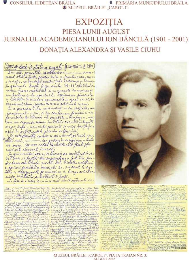 Muzeul Brăilei „Carol I” – Secția Istorie Modernă și Contemporană (Piața Traian, nr. 3), vă invită la o nouă expoziție, care poate fi vizitată până la sfârșitul lunii august: Piesa lunii August – Jurnalul academicianului Ion Băncilă (2 febr. 1901 – 28 martie 2001) /Donația Alexandra și Vasile Ciuhu.