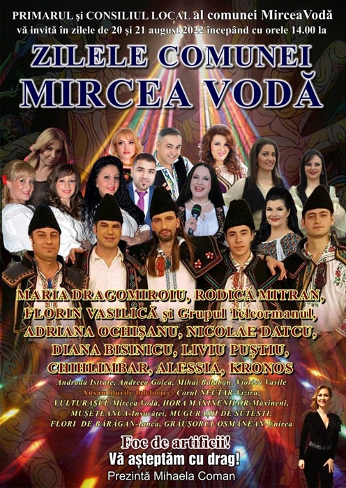Primăria comunei Mircea Vodă (primar Ion Ionescu) și Consiliul Local Mircea Vodă invită în zilele de 20 și 21 august 2022, în parcul central al localitățiii, începând cu orele 14:00, la spectacolul oferit cu prilejul aniversării Zilelor Comunei Mircea Vodă.