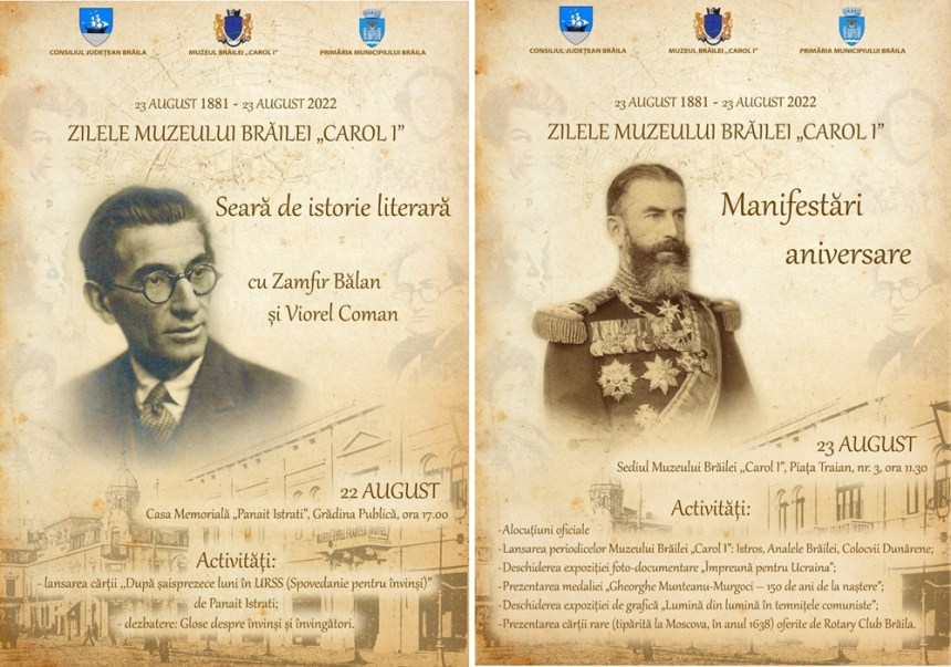 Marți, 23 august, ora 11:30, la sediul Muzeului Brăilei „Carol I” (PiațaTraian, nr. 3), sala „Regele Ferdinand și Regina Maria”, o serie de manifestări aniversare: