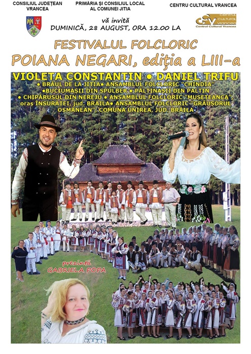 Primăria și Consiliul Local al Comunei Jitia, din Județul Vrancea, în parteneriat cu Consiliul Județean Vrancea și Centrul Cultural Vrancea invită duminică, 28 august 2022, începând cu ora 12:00, în Comuna Jitia, la Festivalul Folcloric Poiana Negari, eveniment aflat la cea de-a LIII-a ediție.