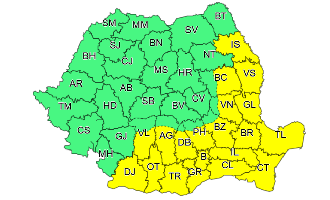 Administrația Națională de Meteorologie a anunțat cod galben de caniculă în regiunile sudice și estice ale țării, printr-o atenționare meteorologică emisă luni, 29 august 2022.