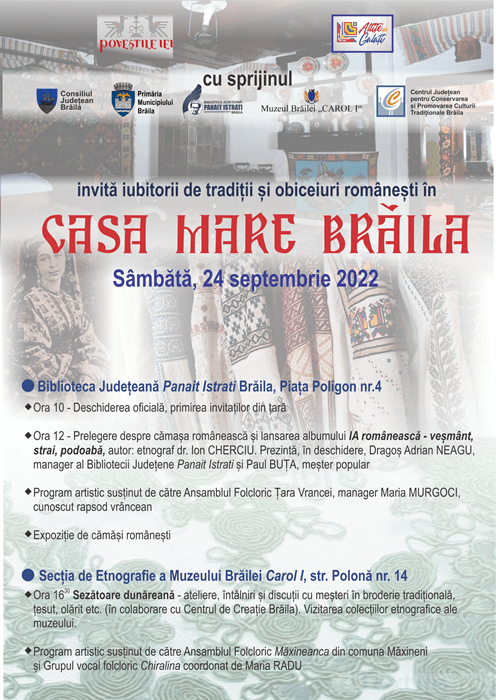 Sâmbătă, 24 septembrie 2022, în cadrul Bibliotecii Județene „Panait Istrati” va avea loc evenimentul sub titlul „CASA MARE BRĂILA”. Alături de invitații sosiți din țară, brăilenii iubitori de tradiții vor putea participa, începând cu ora 12:00, la lansarea albumului „IA românească – veșmânt, strai, podoabă”, autor dr. Ion Cherciu, etnograf.