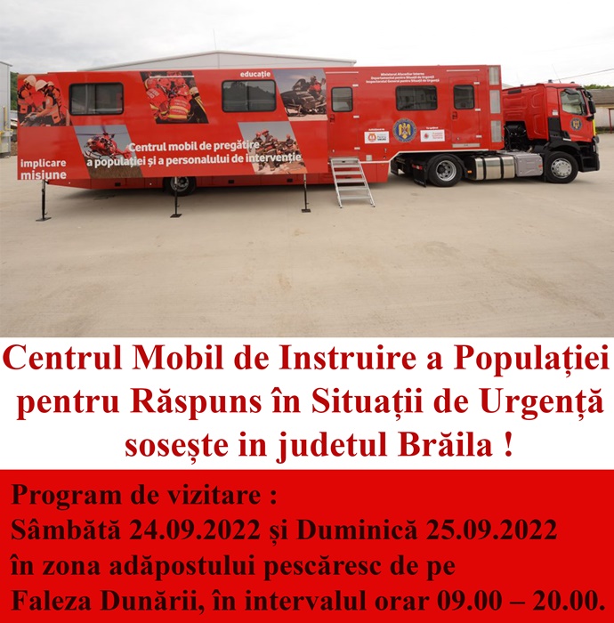 În perioada 24 – 25 septembrie 2022, Centrul Mobil de Instruire a Populației pentru Răspuns în Situații de Urgență va ajunge în Municipiul Brăila.