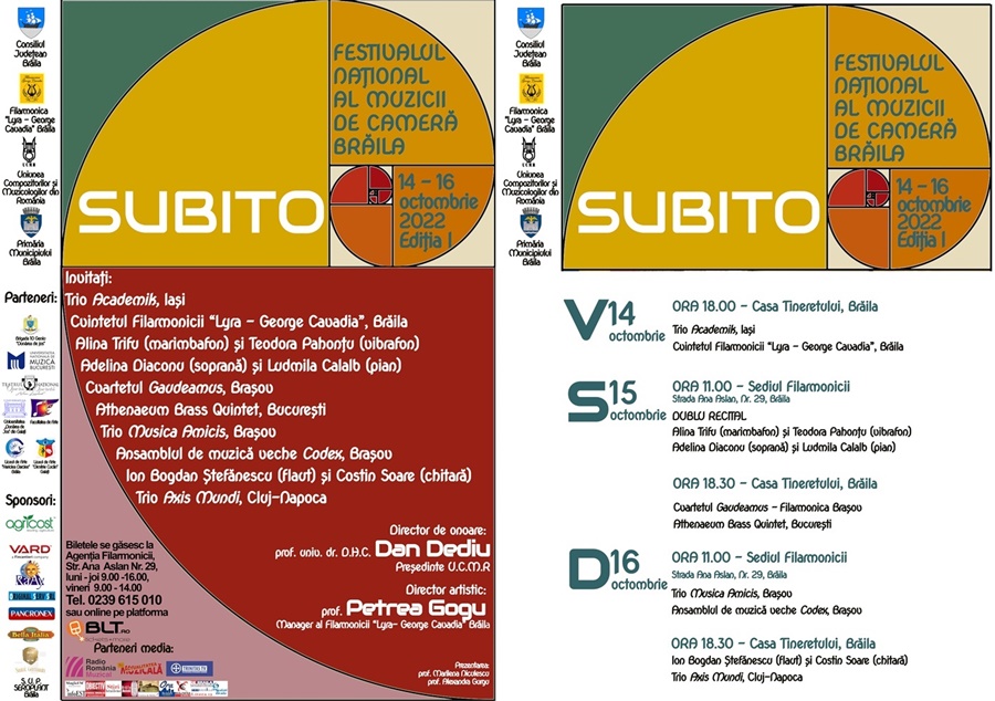Toate acestea vă sunt dedicate dumneavoastră, publicului, fără de care actul artistic este incomplet și fără sens. Vă invităm astfel să întregiți parcursul compozitor – interpret – receptor în stilul SUBITO – Festivalul Național al Muzicii de Cameră, Brăila, eveniment ce se va desfășura pe parcursul a trei zile în perioada 14 -16 octombrie 2022, în două locații distincte, anume Casa Tineretului Brăila și Sediul Filarmonicii “Lyra – George Cavadia”, cu ajutorul partenerilor și al sponsorilor care și-au dovedit de nenumărate ori susținerea față de actul artistic. Vă așteptăm cu drag!”, a adresat o invitație Alexandra Gurgu – Secretar muzical al Filarmonicii “Lyra – George Cavadia”.