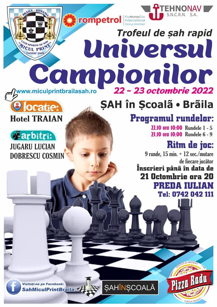 Înscrieri de participare la această mare competiție șahistă se pot face până în data de 21 octombrie 2022, ora 20:00. Mai multe informații despre înscrieri cei interesați pot găsi pe afișul competiției.