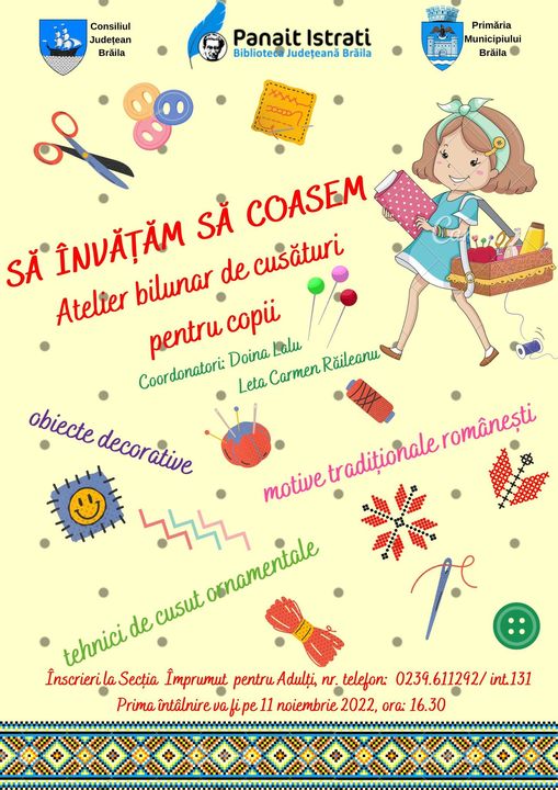Încep înscrierile la atelierul “Să învățăm să coasem!”, din cadrul Bibliotecii Județene „Panait Istrati” din Brăila.