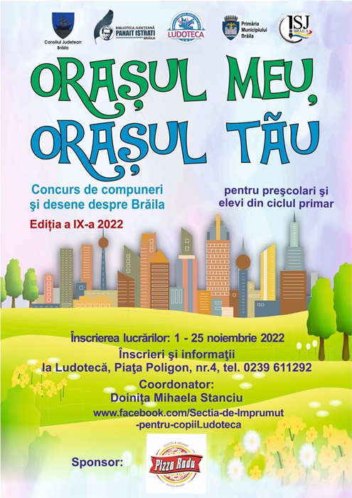 Știm că Brăila este un oraş cu mulţi copii talentaţi, tocmai de aceea, Biblioteca Judeţeană “Panait Istrati” Brăila – Secția de Împrumut pentru Copii.Ludoteca, în parteneriat cu Inspectoratul Școlar Județean Brăila, lansează concursul de desene şi eseuri cu tema “Oraşul meu, oraşul tău”, ediția a IX-a.